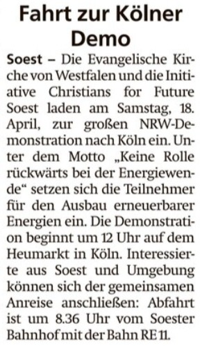 Trotz der enormen Menschenmenge kamen auch Vertreterinnen und Vertreter der evangelischen und katholischen Kirche gezielt zusammen: Hauptamtliche der Evangelischen Kirche von Westfalen, der Evangelischen Kirche im Rheinland, des Kirchenkreises Soest-Arnsberg sowie des Erzbistums Köln beteiligten sich gemeinsam am Protest. Damit setzten sie ein deutliches Zeichen für ökologische Verantwortung und gesellschaftliches Engagement aus kirchlicher Perspektive.
