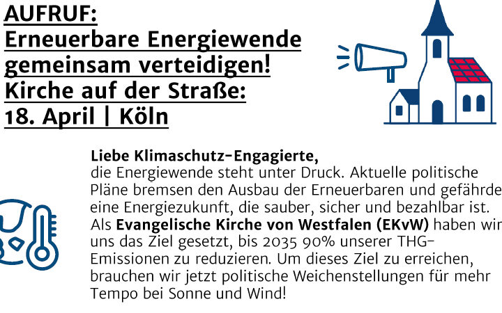18. April in Köln – Kirche auf der Straße Liebe Klimaschutz-Engagierte, die Energiewende steht unter Druck. Aktuelle politische Pläne bremsen den Ausbau der Erneuerbaren und gefährden eine Energiezukunft, die sauber, sicher und bezahlbar ist. Als Evangelische Kirche von Westfahlen (EKvW) haben wir uns das Ziel gesetzt, bis 2035 90% unserer TGH-Emissionen zu reduzieren. Um dieses … AUFRUF: Erneuerbare Energiewende gemeinsam verteidigen! weiterlesen