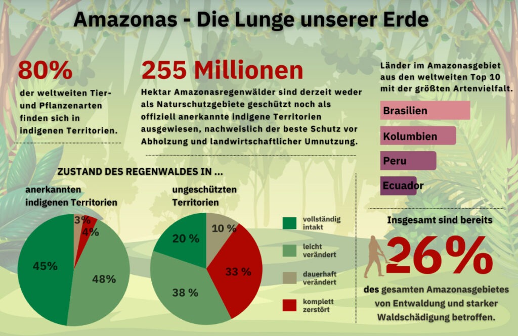 Im Jahr 2024 wurden über 20 Millionen Hektar Regenwald in Brasilien durch Abholzung und Brände zerstört, eine Fläche fast so groß wie Großbritannien. Zusätzlich gelangen durch den illegalen Goldabbau jährlich über 30 Tonnen Quecksilber in die Flüsse. Und hinter diesen Zahlen stehen Menschen: Indigene Gemeinschaften, deren Lebensraum, Nahrungsgrundlage und Zukunft bedroht sind.