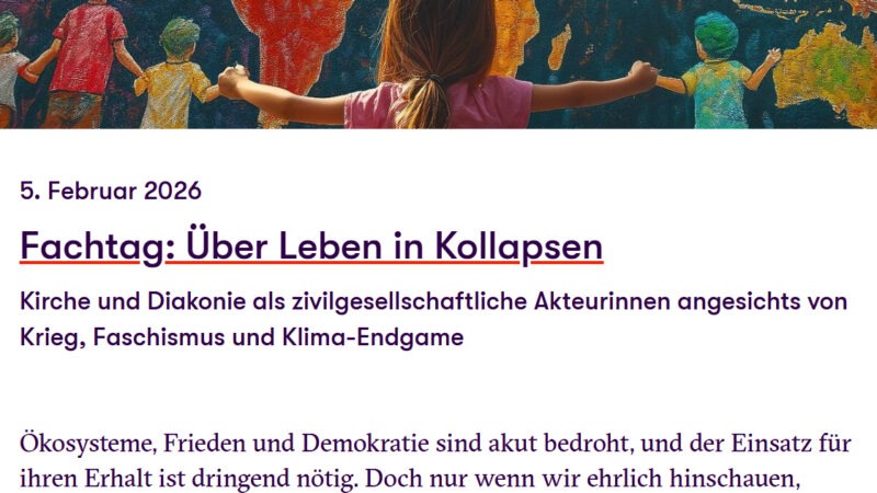 5. Februar 2026 in Köln Kirche und Diakonie als zivilgesellschaftliche Akteurinnen angesichts von Krieg, Faschismus und Klima-Endgame Ökosysteme, Frieden und Demokratie sind akut bedroht, und der Einsatz für ihren Erhalt ist dringend nötig. Doch nur wenn wir ehrlich hinschauen, können wir handlungsfähig bleiben. Was, wenn nicht alles gut geht? Wie können sich Kirchen und Diakonie … Fachtag: Über Leben in Kollapsen weiterlesen