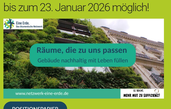 Positionspapiers des ökumenischen Netzwerks EINE ERDE – als Organisationen bis zum 23. Januar unterzeichnen Download des Positionspapiers (pdf) Ohne Verringerung unseres Energie- und Ressourcenverbrauchs werden wir die Klimaziele nicht erreichen. Und dennoch scheint das Thema Suffizienz als zentrales Nachhaltigkeitsprinzip in der politischen Debatte keine Rolle zu spielen. Eine Erde fordert daher ein Umdenken in der Politik. Wir nehmen dazu drei konkrete Politikbereiche … “Gebäude nachhaltig mit Leben füllen!” weiterlesen