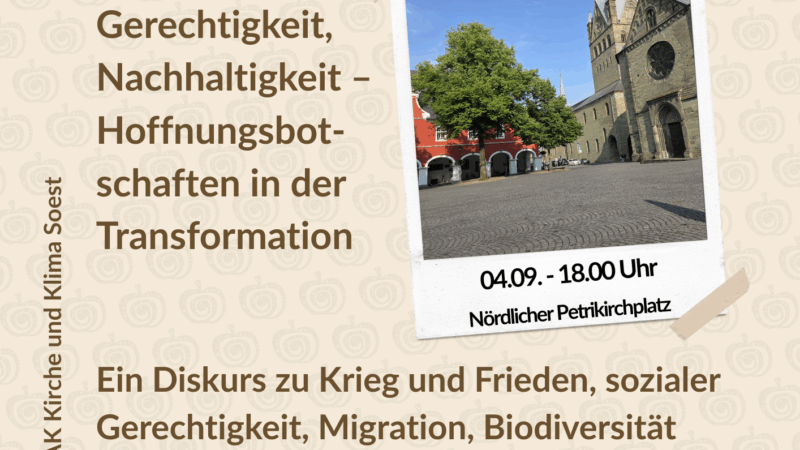 Do. 4. Sep. 18 Uhr, Podiumsdiskussion über Frieden, Gerechtigkeit und Nachhaltigkeit Wir sind Teil der Initiative #VerständigungsOrte www.mi-di.de/verstaendigungsorte (LINK Teilnahme aus der Ferne per Livestream: https://www.youtube.com/watch?v=0bigEIJ9Ehs Unter dem Titel „Kirche mischt sich ein! – Frieden, Gerechtigkeit, Nachhaltigkeit – Hoffnungsbotschaften in der Transformation“ laden kirchliche und zivilgesellschaftliche Organisationen aus Soest zu einer öffentlichen Podiumsdiskussion ein. Die … „Kirche mischt sich ein!“ – Kirche als #Verständigungsort und Hoffnungsort weiterlesen