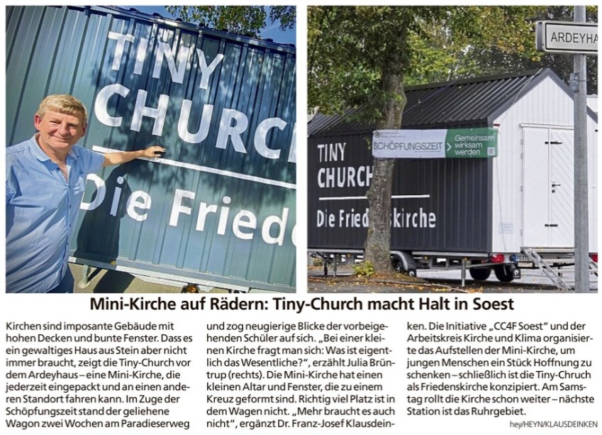 Soest, September 2025 – Seit Anfang September zieht ein ungewöhnliches Objekt am Paradieser Weg die Blicke auf sich: Auf dem Parkplatz vor dem Ardeyhaus steht die „TinyChurch – die Friedenskirche“. Schon von weitem ist die Aufschrift sichtbar, zusätzlich weist ein Banner auf die aktuelle Schöpfungszeit hin.