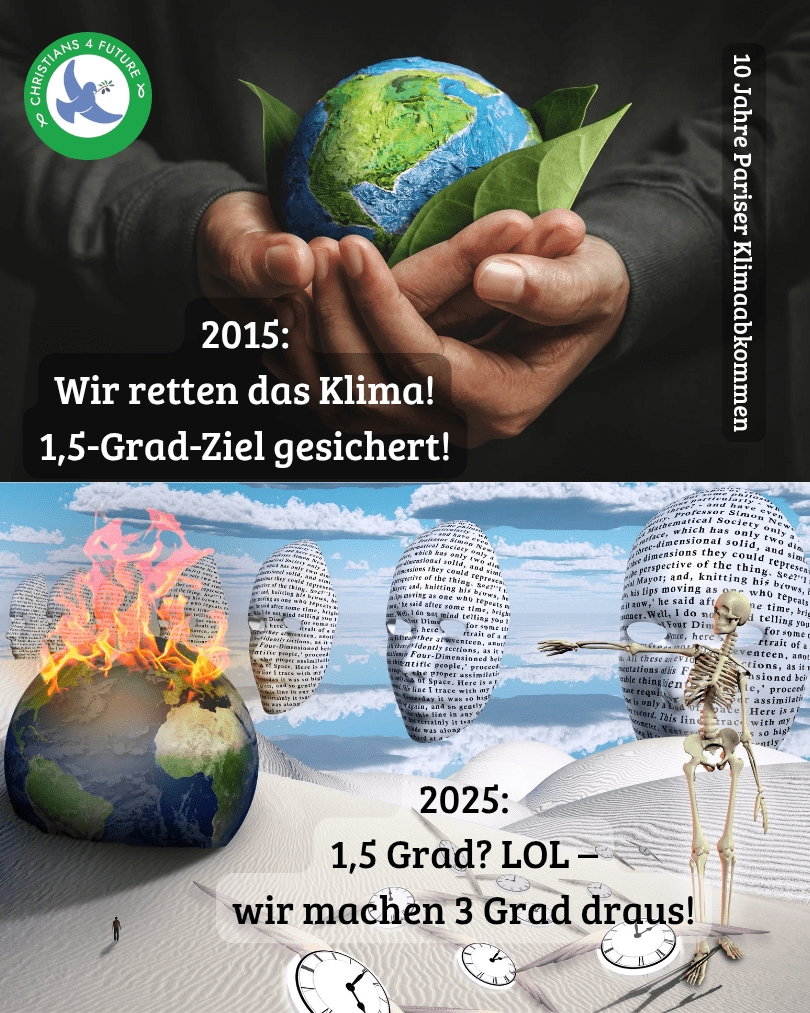 Das Bild mahnt, was passiert, wenn politische Selbstzufriedenheit die Realität verdrängt. Zwischen 2015 und 2025 liegen verlorene Jahre, in denen das 1,5‑Grad‑Ziel nicht entschlossen genug verfolgt wurde. Die Konsequenz ist eine Zukunft, die immer heißer, unsicherer und ungerechter wird.